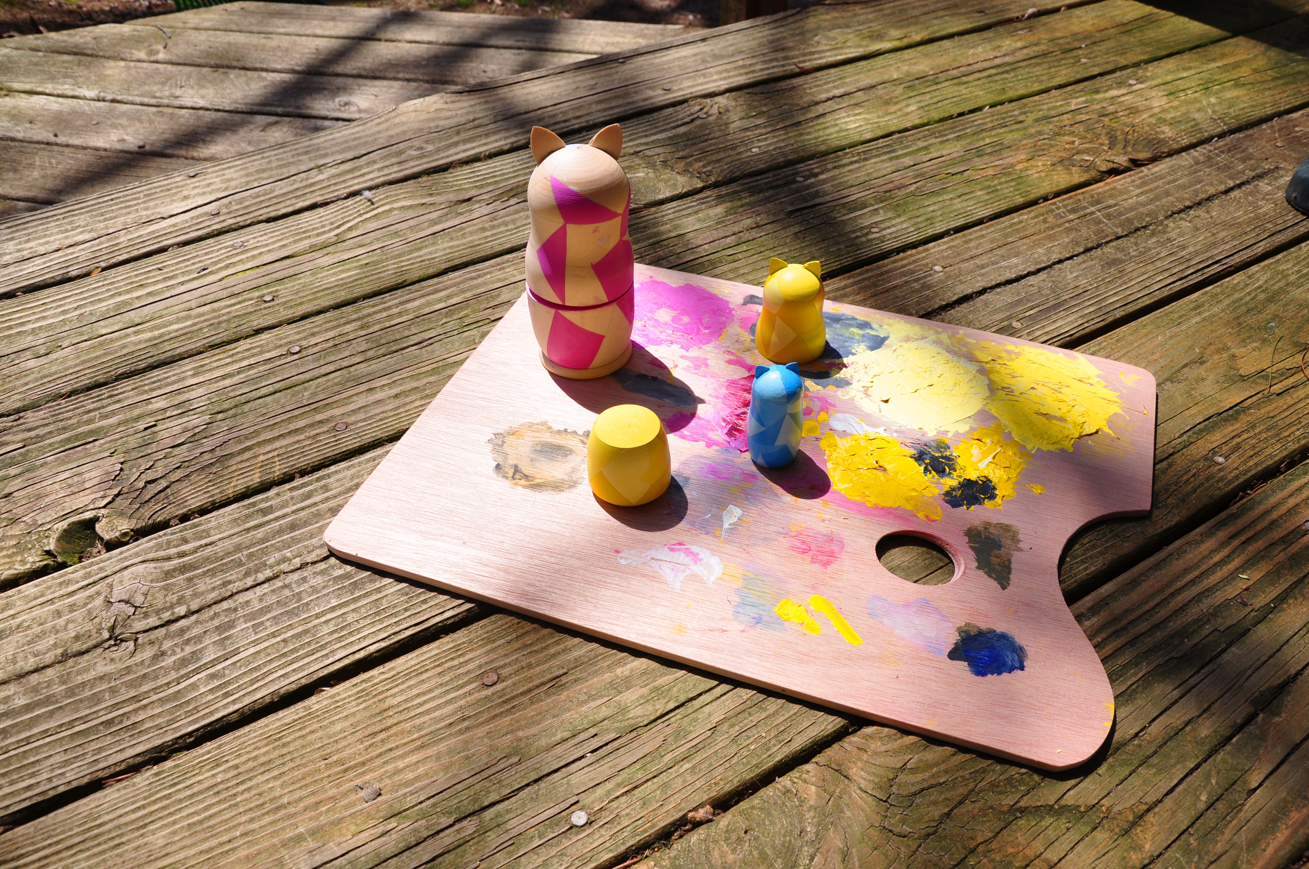 My mom bought me three matryoshka dolls with cat ears around two years ago, and I’ve finally begun painting them. The smallest (blue) is completely painted and sealed, the medium (yellow) has yet to be sealed and I still need to finish painting the biggest doll (pink). Any day now, they’ll all be complete.