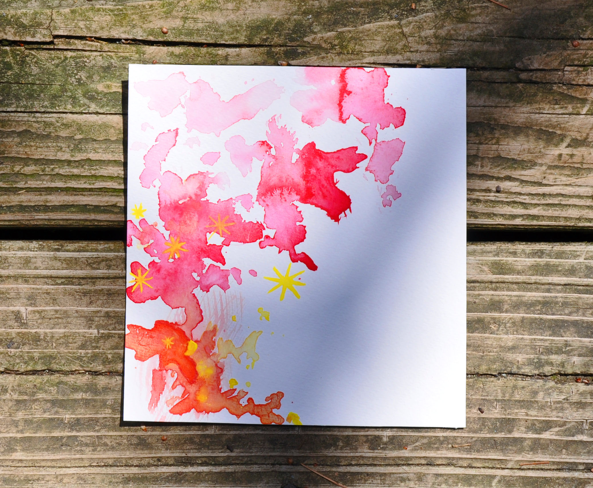Played with red, yellow and white gouache and added yellow gouache sunbursts after the initial gouache dried on the acrylic paper.