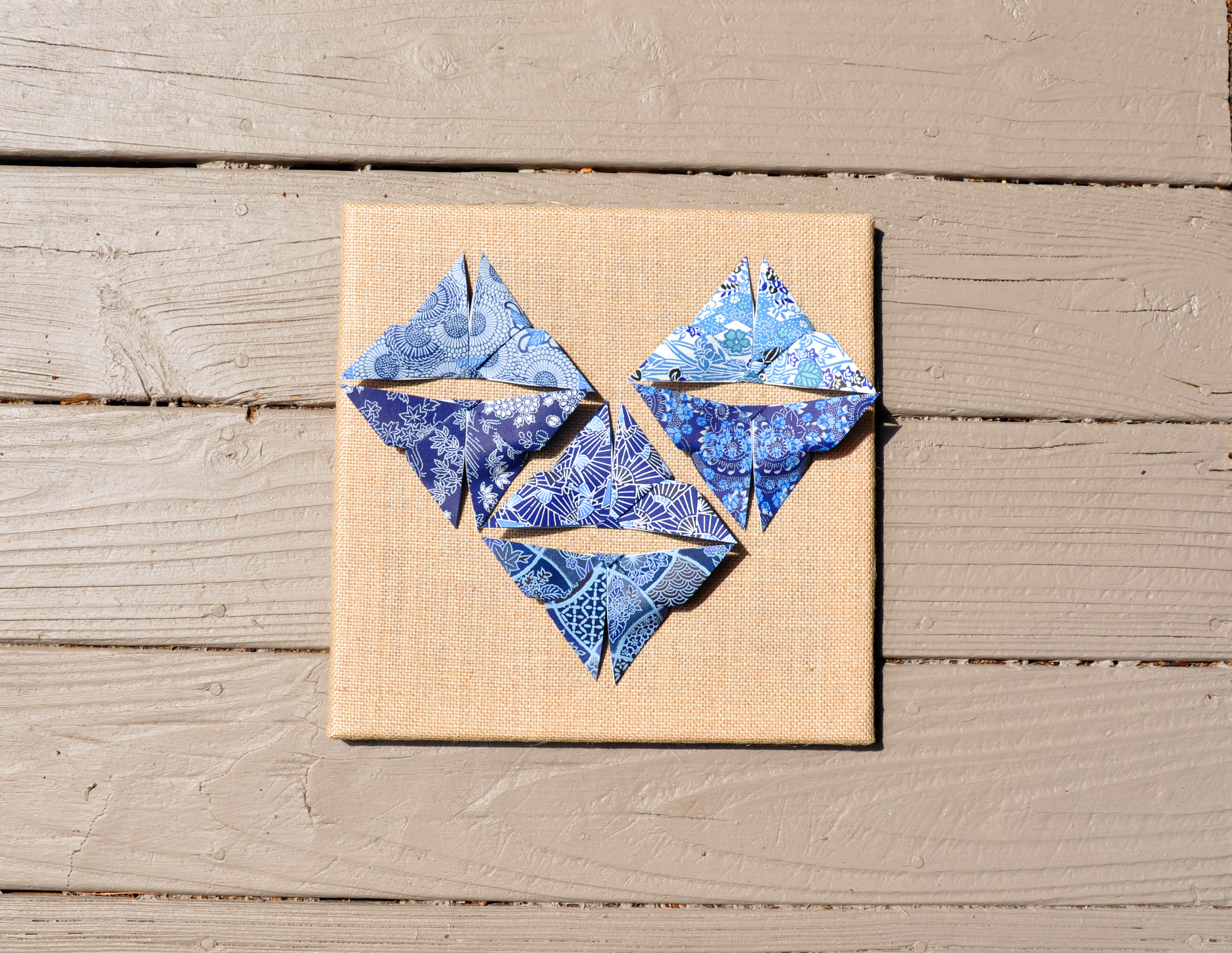 Made this piece for my dad on Father’s Day. It’s a 12″ x 12″ blue printed butterfly origami on a stretched burlap canvas.