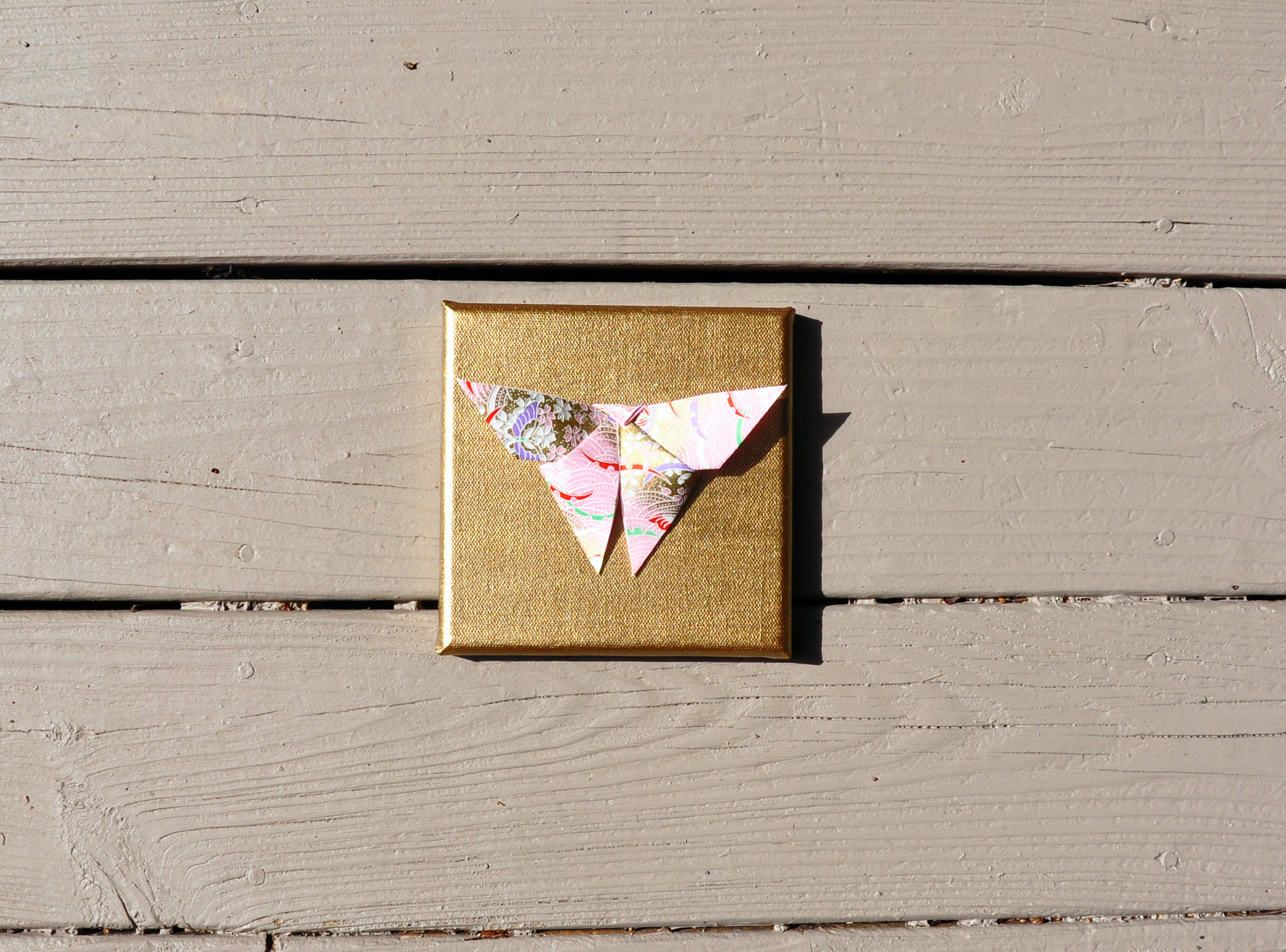 A 6″ x 6″ stretched canvas with acrylic, varnish and a folded butterfly.