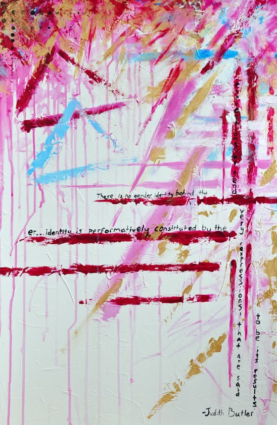 Abstract painting with quote from Judith Butler: “There is no gender identity behind the expressions of gender…identity is performatively constituted … More